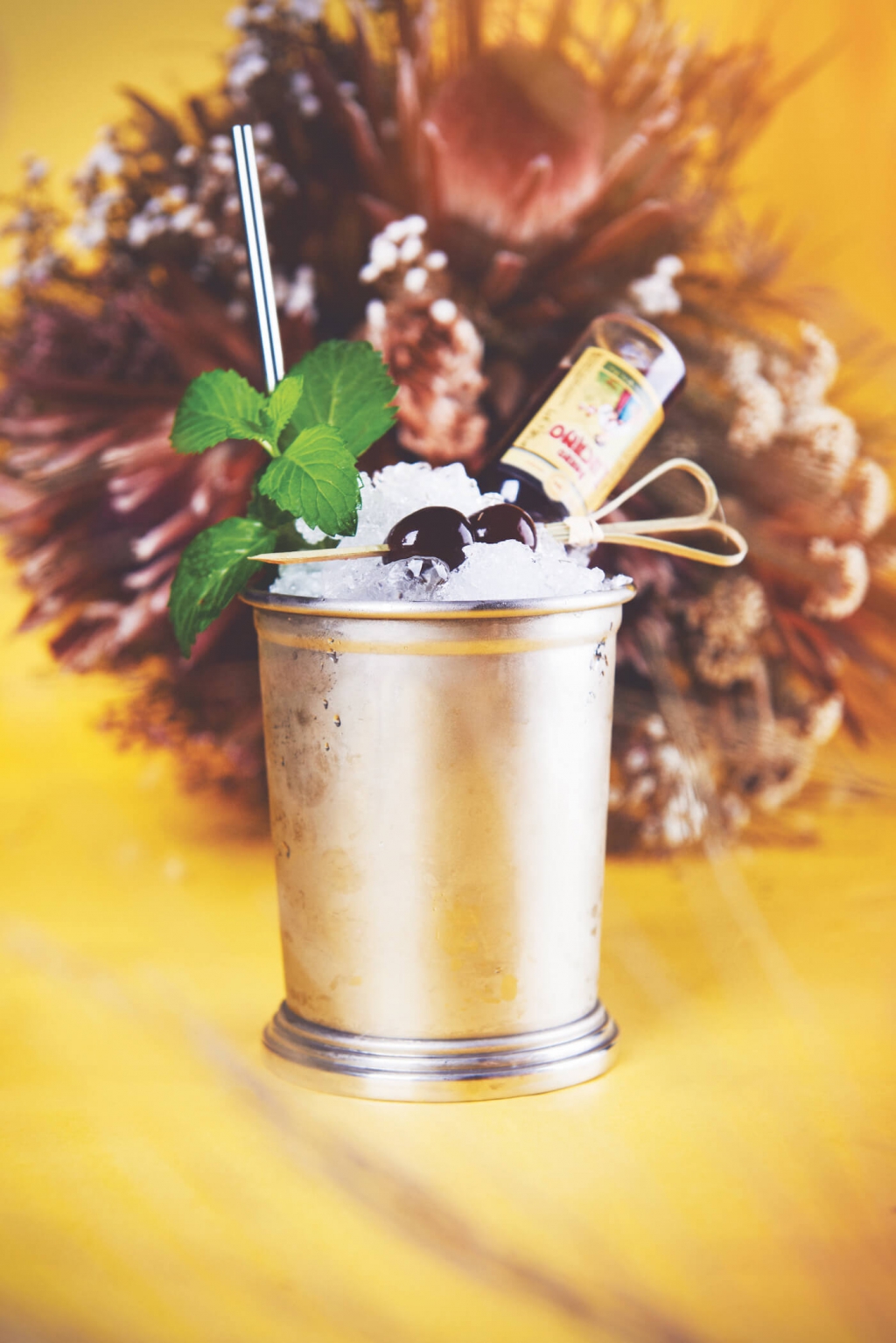 搖勻后倒入裝有碎冰的茱莉普杯。加滿蘇打水,以插在酒簽上的兩顆櫻桃、薄荷枝和迷你盧卡諾裝飾。