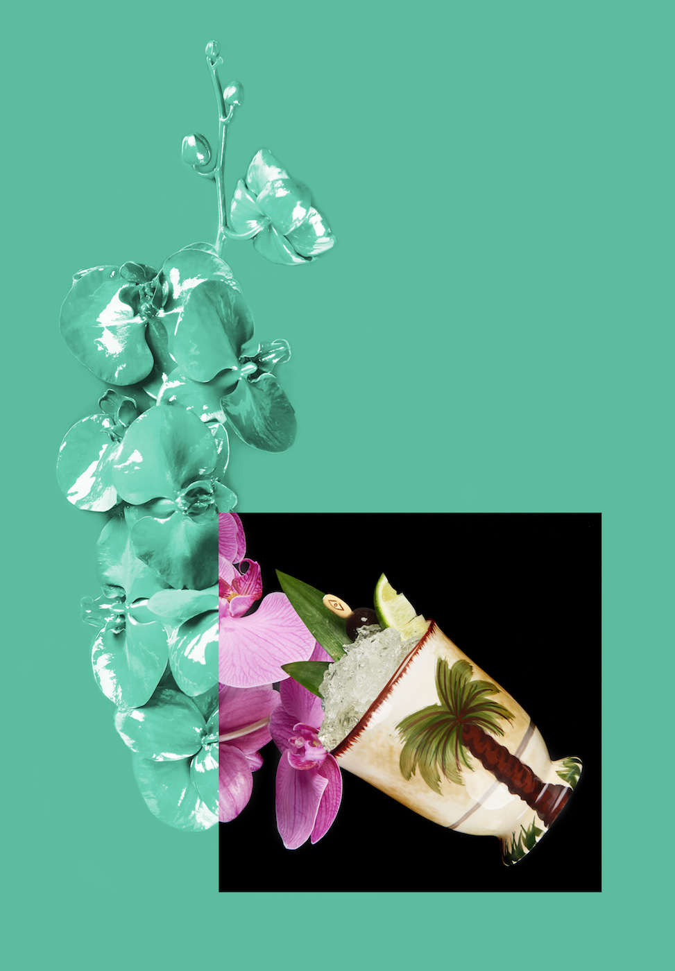 將所有液體放入攪拌機加冰攪拌至口感順滑。倒入小的提基杯,用青檸角、櫻桃、菠蘿葉和一朵雞蛋花或蘭花裝飾。