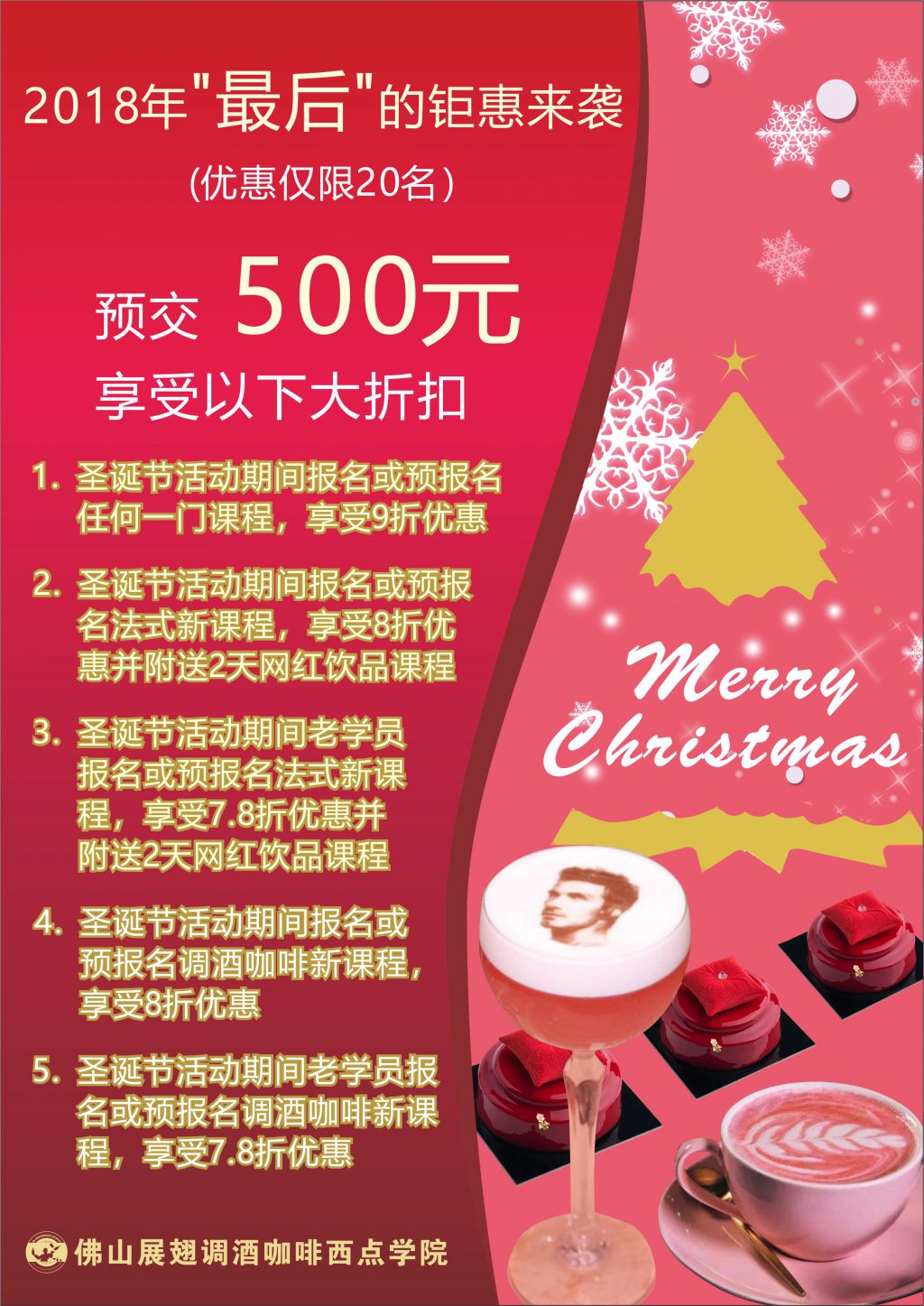 5. 圣誕節(jié)活動(dòng)期間老學(xué)員報(bào)名或預(yù)報(bào)名調(diào)酒咖啡新課程,享受7.8折優(yōu)惠