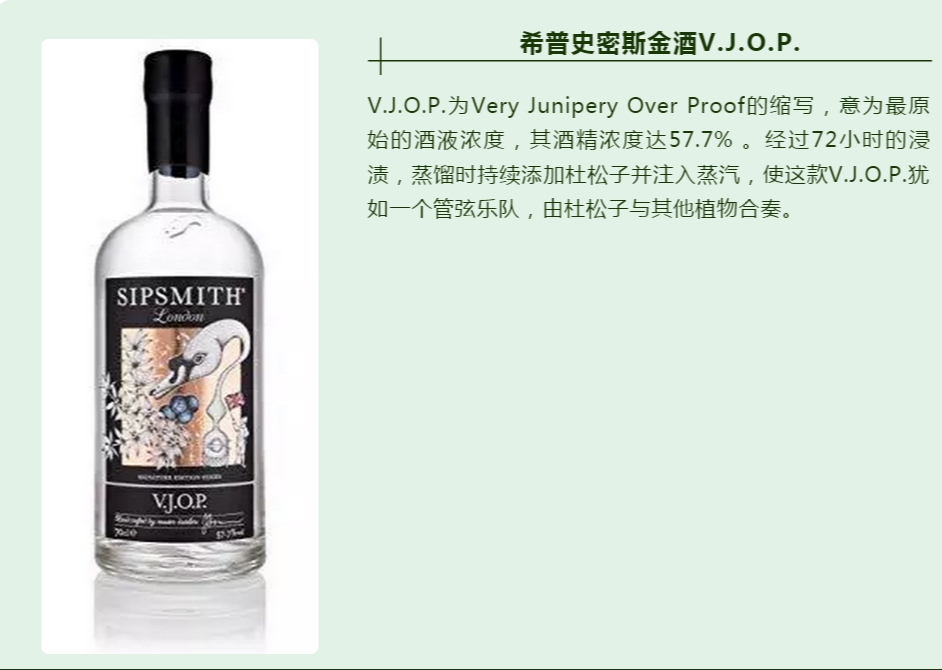 希普史密斯金酒V.J.O.P. V.J.O.P.為Very Junipery Over Proof的縮寫,意為最原始的酒液濃度,其酒精濃度達57.7% 。經(jīng)過72小時的浸漬,蒸餾時持續(xù)添加杜松子并注入蒸汽,使這款V.J.O.P.猶如一個管弦樂隊,由杜松子與其他植物合奏。