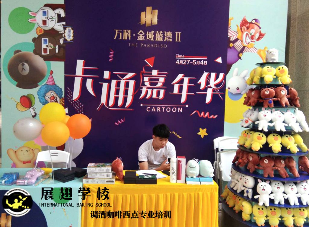 2019年4月27日,萬科.金域藍灣卡通嘉年華,展翅調酒咖啡西點培訓學校的咖啡師被邀請到現場咖啡拉花表演