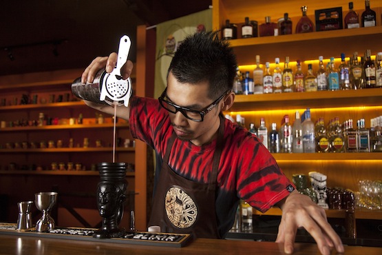 為什么做提基酒吧?就是因為上海還沒有。此外,朗姆酒在中國是一個尚未受到足夠重視的酒種。當然已經有酒吧在著手推廣朗姆,比如主打加勒比主題的Rhumerie Bounty,現在又有具有東南亞殖民地風格的Starling。這兩家都有不少朗姆酒收藏,不過都不是以提基風格為特色的酒吧。而我們這里是主推提基文化的酒吧。我們的靈感源于南太平洋島嶼——我們研究了許多照片后確定了內裝風格和色系,以及采用舊木門制成的桌子。Tiki China共有上下兩層,樓下是餐廳,大約200平米,由主廚David Leong負責, 樓上是酒吧,由何浩云負責。餐廳和酒吧相結合的益處是顯而易見的:不僅可以帶來更多客人,也可以通過更大的采購量控制成本。