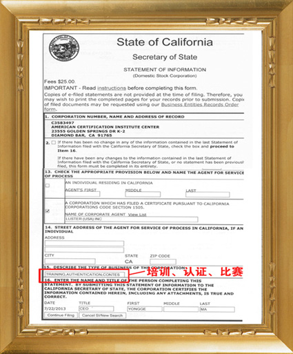 美國加利福尼亞州政府頒發(fā)的注冊(cè)證書