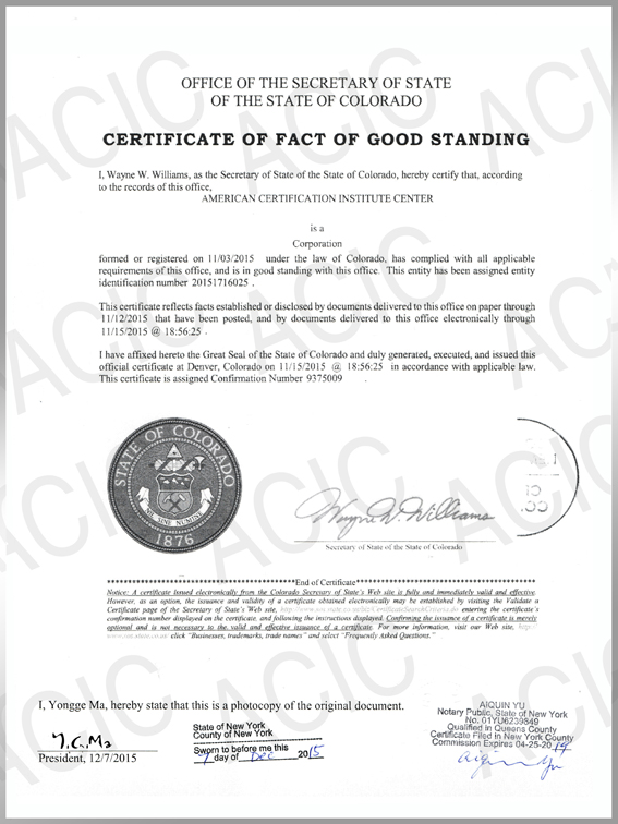 美國科羅拉多州政府頒發(fā)的注冊(cè)證書(經(jīng)美國公證處及紐約州務(wù)卿公證)
