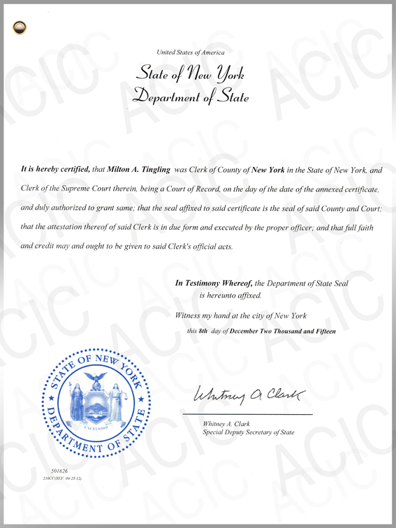 美國紐約州政府及特別州務(wù)卿Whitney A.Clark頒發(fā)的公證書