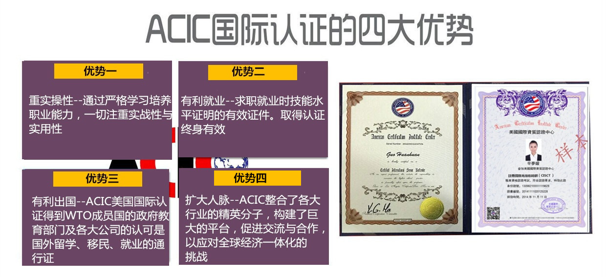 ACIC認(rèn)證代表了當(dāng)今職業(yè)資格認(rèn)證的國際水平,客觀地評(píng)價(jià)從事相關(guān)行業(yè)人員的專家級(jí)的知識(shí)和能力水平,取得認(rèn)證對(duì)個(gè)人有四大益處:一是培養(yǎng)能力:即通過嚴(yán)格學(xué)習(xí),培養(yǎng)相關(guān)職業(yè)的實(shí)際能力,代表該領(lǐng)域內(nèi)得到專業(yè)水準(zhǔn);二是有利出國:ACIC認(rèn)證資格得到WTO成員國的政府、教育部門及各大公司的認(rèn)可;三是有利就業(yè):ACIC認(rèn)證培訓(xùn),一切注重實(shí)戰(zhàn)性與實(shí)用性,引導(dǎo)當(dāng)今培訓(xùn)新潮流,符合全球經(jīng)濟(jì)一體化化對(duì)人才的需求,取得認(rèn)證,終身有效,可以在各類公司及政府部門謀職,有利于您在各行業(yè)脫穎而出。同時(shí)ACI為所有通過認(rèn)證者備案,利用廣泛的渠道,加強(qiáng)交流與合作,選拔優(yōu)秀者。四 擴(kuò)大人脈圈:ACIC整合了各個(gè)行業(yè)的精英分子,構(gòu)建了巨大的平臺(tái),促進(jìn)交流與合作,以應(yīng)對(duì)全球經(jīng)濟(jì)一體化的挑戰(zhàn)。